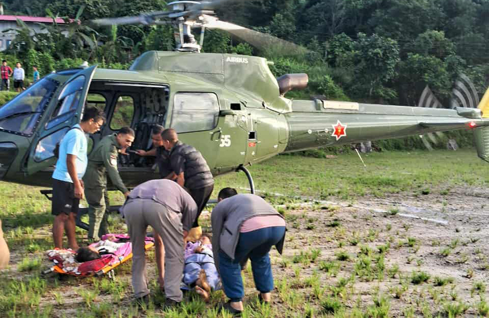 इलाम, सन्दकपुर नगरपालिका–४ माबु इलाकामा पहिरोले घाइते भएका १ जना पुरुष र ३ जना महिला (१ बालिका सहित) स्वास्थ्य चौकीमा प्राथमिक उपचार पछि थप उपचारको लागि नेपाली सेनाको हेलिकोप्टरद्वारा झापा स्थित अस्पतालतर्फ लगिएका छन्।