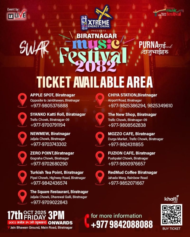 विराटनगर ट्राफिक चौक मोजो क्याफे, साईन्को कटिरोल, द न्यु सप , रेड मड क्याफे रेन्बो गल्ली , मेन रोड न्यु म्यु चस्मा घर, द स्कवार रेष्टुरेण्ट , एप्पल एस्पट जैन भवन अगाडी , जिरो प्वाईट रेष्टुरेष्ट बरगाछी, टर्किस टि प्वाइनट पिपल चौक , चिया स्टेशन एयसर्पोट , फूजन पुष्पलाल चौक लगायत खल्ति एपमा पनि काट्न सकिने छ । टिकटको दर जनरल ३ सय र भिआईपी १ हजार रुपैया रहेको आयोजकले जनाएको छ ।