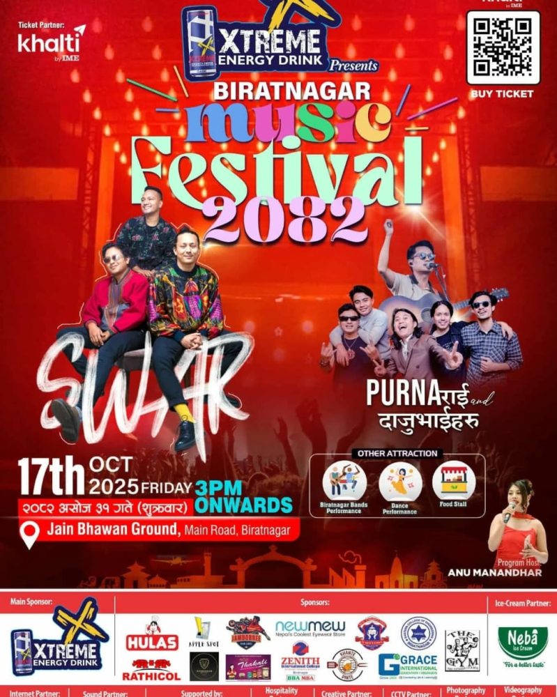 यही असोज ३१ शुक्रबार साँझ विराटनगरको जैन भवनमा भव्य साँगितीक कार्यक्रम हुदैछ । लाईभ ईन्टरटेडमेन्टको आयोजनामा विराटनगरमा चौथो सस्करणको विराटनगर म्युजिक फेष्टिभल हुदैछ । यसको लागि अहिले आयोजकले तिव्र रुपमा तयारीलाई अगाडी बढाईरहेको छ । आयोजकले कार्यक्रममा सहभागिता जनाउनको लागि अहिले विराटनगरका ११ स्थानमा टिकट उपलब्ध हुने गरी टिकट राखिदिएको छ । आम विराटनगरवासीलाई सहज रुपमा टिकट उपलब्ध होस भन्ने उदेस्यले विराटनगरका विभिन्न क्याफे, रेष्टुरेण्ट तथा सपिङ स्टोरहरुमा राखिएको विराटनगर म्युजिक फेष्टिभलका कार्यक्रम संयोजक सेन्ट्रो महतले जानकारी दिए ।