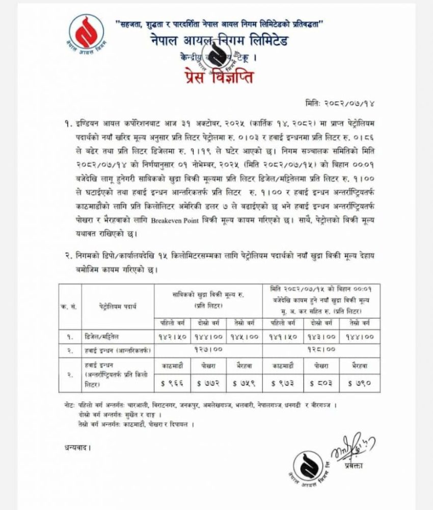 शनिबार (कात्तिक १५)बिहानदेखि लागु हुने गरी डिजेल र मट्टीतेलको मूल्य घटाइएको निगमले जनाएको छ ।
