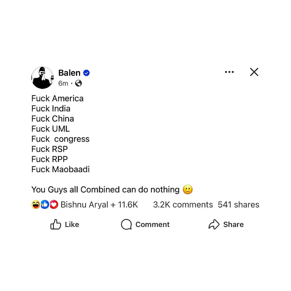 लगभग आधा घण्टापछि बालेनले उक्त स्टाटस हटाएका थिए । तर त्यसअघि नै उनको अभिव्यक्ति भाइरल भइसकेको थियो । जसको स्क्रिसट धेरै जना प्रयोगकर्ताले लिइसकेका छन् । जुन यतिबेला सञ्जालभरी छन् ।