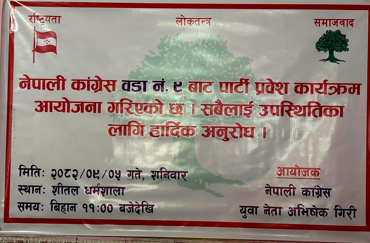 नेपाली कांग्रेस विराटनगर महानगर सभापति पदका लागि प्रबल दाबेदारका रूपमा हेरिएका युवा नेता तथा समाजसेवी अभिषेक गिरीको विशेष पहल र सक्रियतामा आज विराटनगर वडा नं. ९ मा भव्य पार्टी प्रवेश कार्यक्रम सम्पन्न भएको छ।